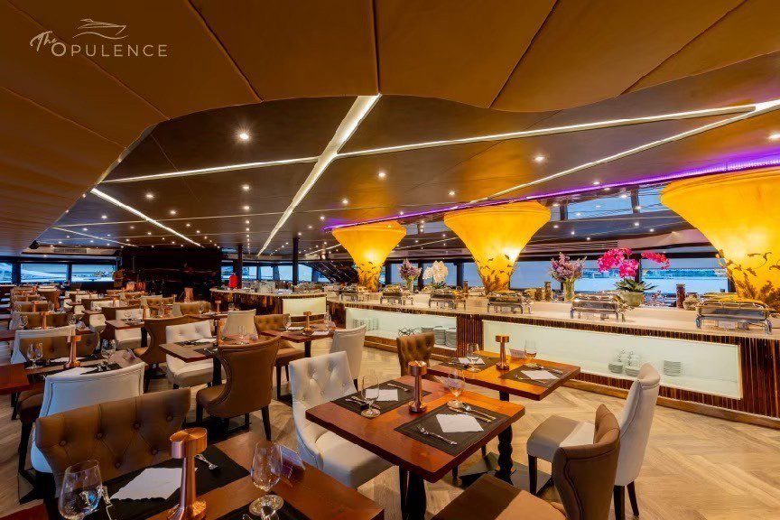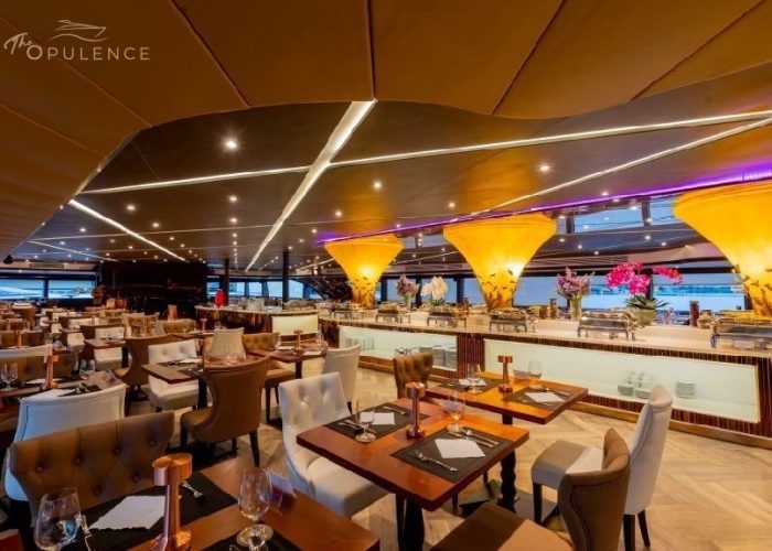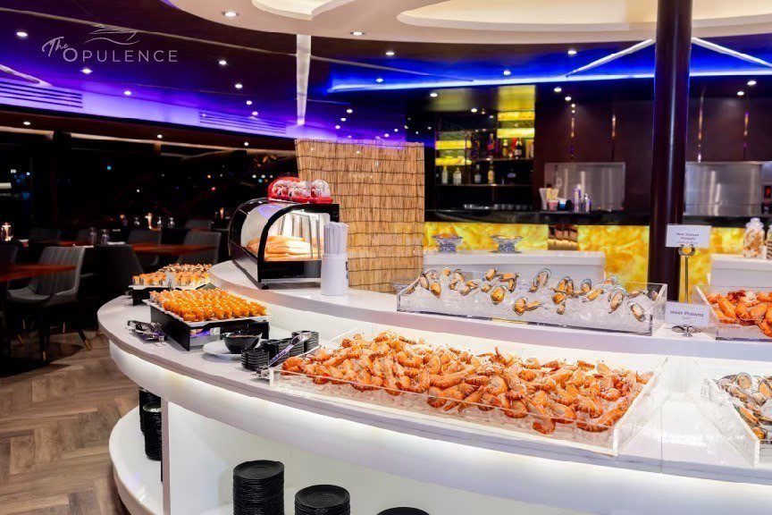 Begin by making your way to your boat in Bangkok. Board the boat, take your seat, and set off. Order yourself a drink, and take in views of the city from your window as you glide along the Chao Phraya River. Relax and enjoy a live band onboard as you sip on your drink.